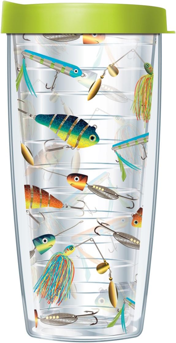 Price review Signature Tumblers Fishing Lure Wrap on Clear 16 Ounce Double-Walled Travel Tumbler Mug with Lime Green Easy Sip Lid